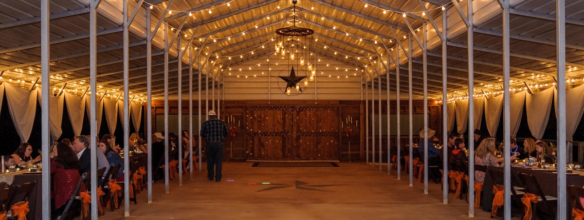 Our Rustic barn building has an open floor plan with a stained and etched Texas star concrete floor. There are curtains that can be opened to let the breeze in or closed to keep the cold out. We have AC, indoor bathroom facilities, ample lighting and electric for entertainment equipment and band. Plus we can add in the temporary tents for the caterers needs.